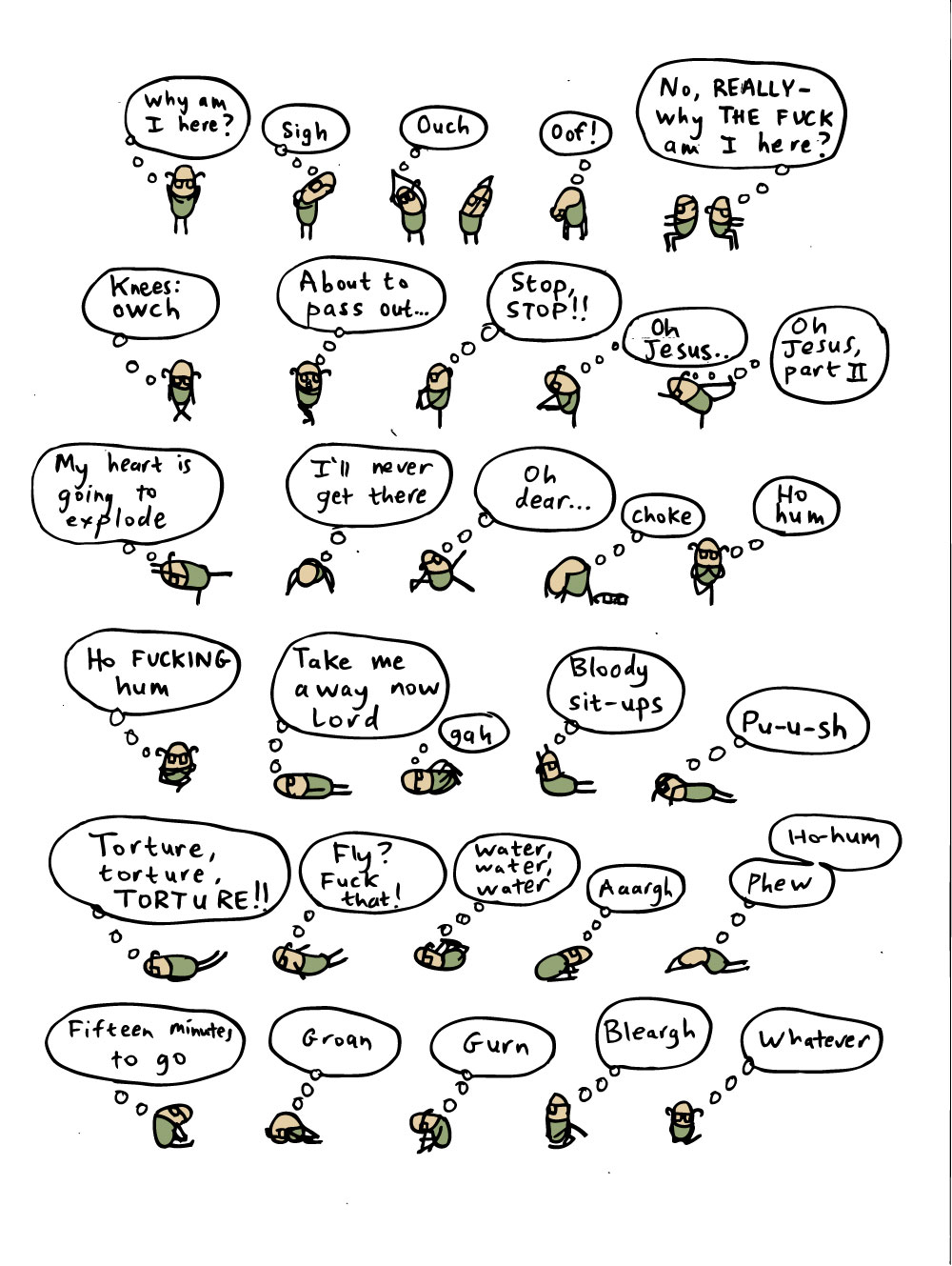 I fully plan to master all 26 postures below, even though I know I will be feeling like the thought bubbles in the image below the image below.